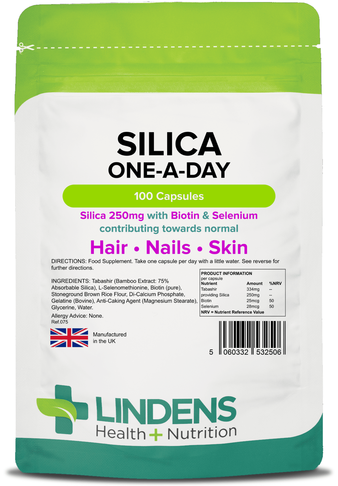 Lindens Silica 250mg Capsules are also fortified with biotin, a B Vitamin that contributes to the maintenance of normal skin and hair, and selenium, a powerful antioxidant that contributes not only to the protection of cells from oxidative stress, but also the maintenance of normal hair and nails.