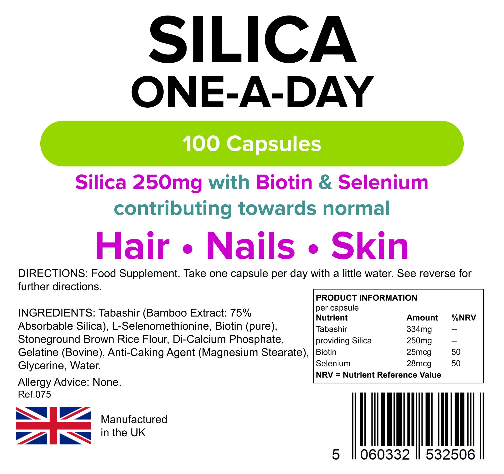 Each capsule provides 250mg of silica, in addition to 100% NRV (Nutrient Reference Value) of both Biotin and Selenium.